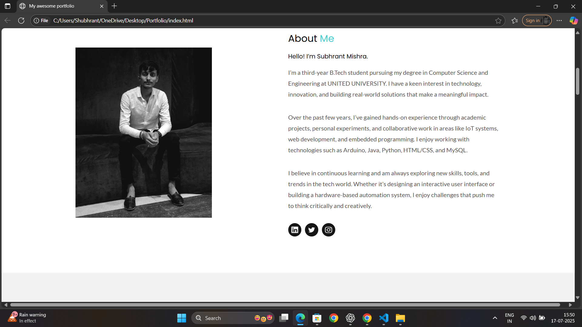 I believe in continuous learning and am always exploring new skills, tools, and trends in the tech world. Whether it’s designing an interactive user interface or building a hardware-based automation system, I enjoy challenges that push me to think critically and creatively.